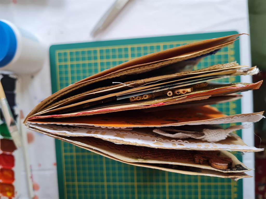 Ein altes Buch oder ein gekauftes bzw. selbst gemachtes Notizbuch aus verschiedenen Papieren – auch recycelten – wird durch Ihre Gestaltung mit verschiedenen Materialien wie Farben, Collagen, Stoffresten, Zeitungsausrissen und vielem mehr zu Ihrem ganz eigenen Kunstwerk.
