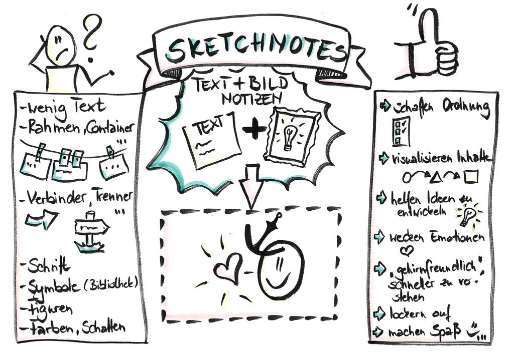 Für das Erstellen von Sketchnotes müssen Sie nicht gut zeichnen können, einfache Formen und Grafiken sind schnell erlernt.