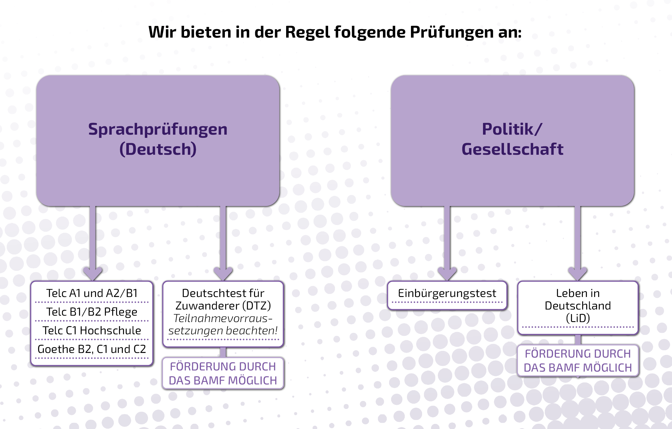 Informationen und Termine für die telc- und Goethe-Prüfungen sowie den Einbürgerungstest finden Sie unten (grüner Punkt: freie Plätze vorhanden / roter Punkt: Prüfung ausgebucht). Sobald Ihre gewünschte Prüfung aufgelistet ist und freie Plätze verfügbar sind, melden Sie sich bitte persönlich am Servicepunkt in der Volkshochschule im Rahmen unserer Öffnungszeiten an.